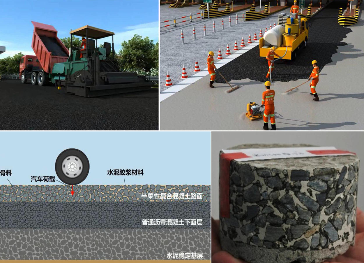 半柔性復(fù)合混凝土路面是以開級配大空隙(VV:18~28%)特種瀝青混合料為基體,灌入特制的水泥基灌漿料填充其內(nèi)部空隙,而形成的一種“剛?cè)岵?jì)”的新型路面材料與結(jié)構(gòu)。具有應(yīng)力松弛能力的柔性骨架和不受高溫影響的剛性網(wǎng)絡(luò)結(jié)構(gòu)為一體,使之充分發(fā)揮瀝青材料低溫變形能力強(qiáng)的優(yōu)勢,同時(shí)通過水泥基材料提供高溫強(qiáng)度和抗變形能力,具有高強(qiáng)、早強(qiáng)、抗裂、防滑、耐油蝕等特性。